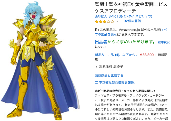 高浪ひろしの「プレミア商品の紹介」のお時間です。 今日も、お世話になります。 今回は、聖闘士聖衣で狙い目のピスケス玩具を紹介します! この玩具がアマゾンで価格高騰中! お宝商品名: 聖闘士聖衣神話EX 黄金聖闘士ピスケスアフロディーテ 販売額:33800円 定価:6600円 janコード:4543112701732 定価とアマゾン相場との差額がかなり出ていますね。 聖闘士星矢は、黄金聖闘士(ゴールドセイント)と、 主人公の5名のキ...