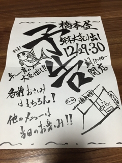 JUGEMテーマ:起業 先日もご紹介した明日(29日)、明後日(30日)の2日間で予定している年末大売出し! 通常は、飲食店に魚介類をご提供することをメインとしている弊社が、毎年年末の2日間だけ、ご家庭向けに年末年始におせち料理の横に一品加えていただけるような魚介類等をご準備するイベント ラインアップがほぼ出揃ってきたので、ご紹介 ====== 刺身(ご予算に応じてその場で切り付けします!) ・本まぐろ 赤身〜大トロ ・ブリ ・ヒラメ ・アコウ ・スジアラ ・イカ ・タコ ・〆サバ ...