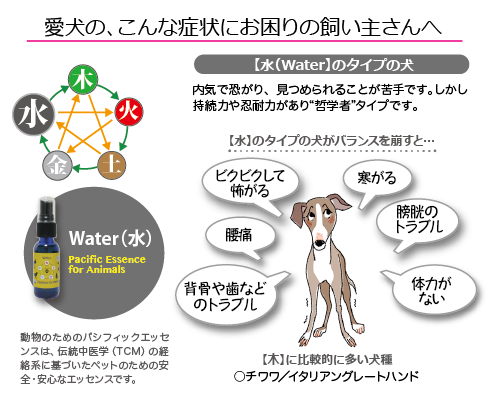 【水(Water)】のタイプの愛犬の体調不良に 伝統中獣医学では【水】のタイプは内向的で恐がりな性格ですが、持続力や忍耐力があり“哲学者タイプ”と言われています。 水のタイプの心身のバランスが崩れると、背骨や関節などの骨のトラブルや、泌尿器系の病気など腎や膀胱のトラブルをお起こしやすくなります。 ◎動物のこんな症状に… ●歯、骨、背骨のトラブル ●関節のトラブル ●腰痛 ●体力がない ●泌尿器系のトラブル(膀胱炎など) ●怖がってビクビクしている &...