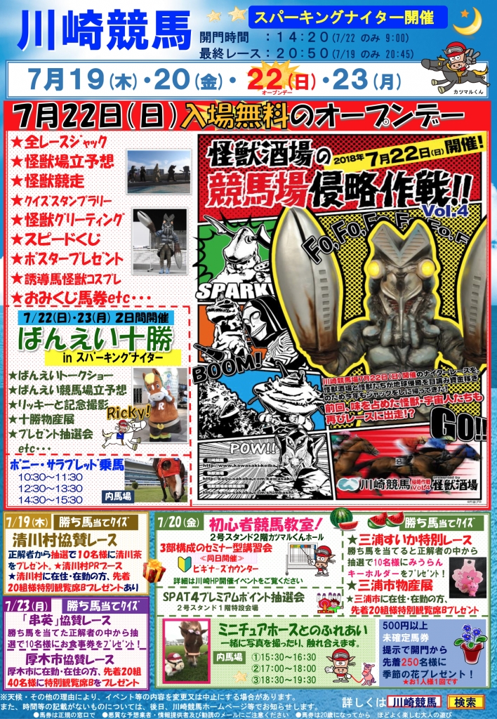 平成30年度第5回川崎競馬の出走予定を発表します 7/20 4R エミネントフラワー 馬主:平野 郁朗様 7R ナデシコハート 馬主:平野 郁朗様 7/22 7R エグランティエ 馬主:松本 順子様 7/23 5R ウルティムホーマ 馬主:伊橋 寿夫様 出走確定は各レース二日前です 川崎競馬場7/22は入場無料のオープンデー! またまた怪獣たちにジャックされます(;_;) 詳しくはこちら→https://www.kawasaki-keiba.jp/event/ JUGEMテーマ...