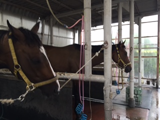 今日は大雨です ウィンちゃん(リバーウィン)も雨にうたれながら頑張りました ウィン:雨でも頑張ったわよ ▼ウィンちゃん(右)&小町ちゃん(左:バライロコマチ) 早朝はまだちょっと寒いので、雨に濡れた体はホットガンで乾かします タキノちゃん(タキノアクトレス)は一頭で調教です お馬さんも騎乗者もカッパ装備で準備運動です タキノちゃんいってらっしゃ〜い JUGEMテーマ:馬