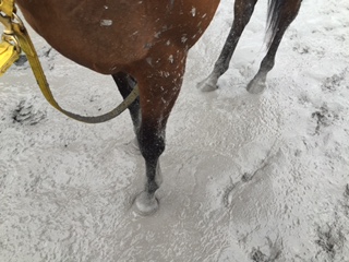 梅雨まっただ中・・・調教時間には雨が止んでいるんですが、なかなか太陽が出なくて馬場が乾きません足元がどろどろです ▲▼運動馬場は水田どころが踏まれ過ぎて稲も立たないくらいのゆるさになっております 厩舎ではダルメシアン柄が大流行ですお馬さんを引いているワタクシ共もカッパを着忘れるとこんな感じ足元は完全にツートンカラーリバ男君(リバーケイティ)も、もちろんドロドロ自分の足ではねた泥で泥棒ヒゲ出来てますリバ男君はやっぱりこんな感じに全身洗い お疲れ様 明日はお休みですJUGEMテーマ:馬