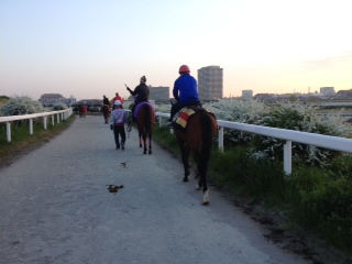 厩舎近くの公園の桜が咲きましたぁ〜今日は花見に行くかぁ・・・なんて思ったら夕方から雨 よくある事です朝はいつも通り調教から始まりましたリバ男君(リバーケイティ)朝焼けの中を走ります競走馬は背中で騎乗者へ語ります・・・byリバ男こちらは明日競馬の2頭です カラッと晴れてて、晴れ牡馬&晴れ牝馬!ツヤッ艶なパリちゃん(パリーナチャン)ラッシュ君(ベルモントラッシュ)も筋肉隆々艶々お尻いい感じでハッキングしてるパリちゃんラッシュ君前走から着け始めたシャドーロールも決まって☆おります▼ラッシュ君はまだお尻撮って...