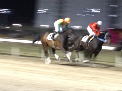 いつもカメラ担当しているiphoneさんが水没しまして、本日は急遽電話担当のガラケーさん(スマートフォンに対して従来の携帯の事をガラパゴス携帯と言うらしい)が二役することになりましたシャッターの反応が遅いので、画面内におさめるのが大変パリちゃん(パリーナチャン)はなかなかよく撮れましたラッシュ君(ベルモントラッシュ)は・・・あぁ可愛いお顔が・・・2頭の追い切りです先に行くのがパリちゃん、後ろがラッシュ君ゴールの瞬間は撮れませんでした・・・皆様、携帯はこまめにバックアップし、破損、水没、紛失には充分お気を...