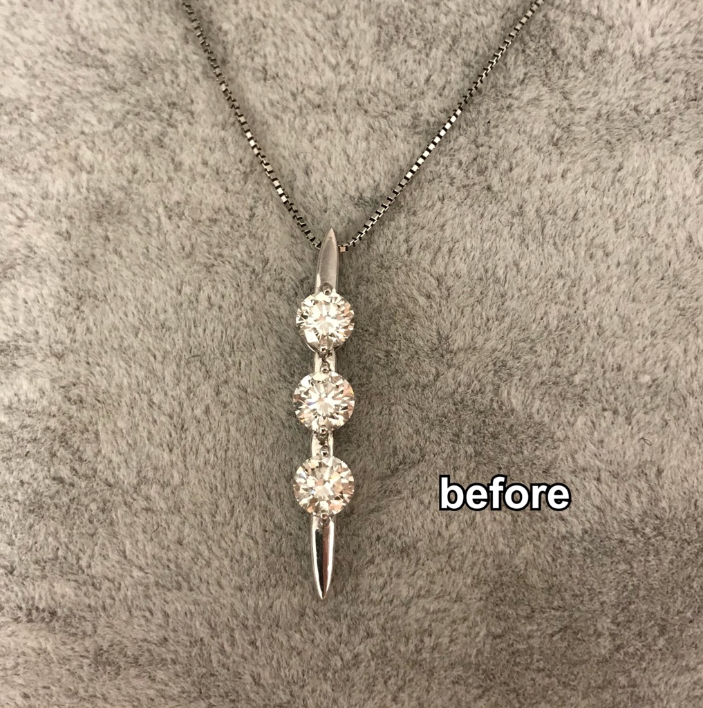 Ptダイヤモンドネックレス 3粒ダイヤのネックレスのリメイク依頼です。 丸めてひっかけると違うデザインになるペンダントトップです。 シンプルなデザインにリメイク希望でしたので下の2粒のダイヤモンドをカットしました。 枠を全て変えると高くなるので、カットのみでリメイクさせていただきました。 シンプルな...