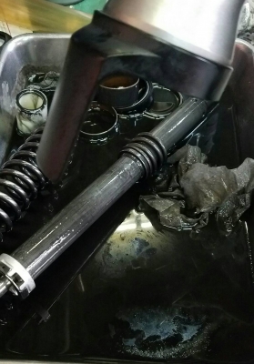 JUGEMテーマ:修理・カスタマイズ 0309 ZZR フロントフォークOH完了 45,540km 前回OHから25,000km以上走行したオイルは どろどろな状態でした! 各シール、インナーとアウターのブッシング、スプリングを交換 オイルは、純正KHL 15-10にしました。 スプリングは5mm伸びていたようです。(前回交換時と同じ結果) Fに合わせて、リアショックのダンピングを3にしたそうです。 確か元は2だったのでちょっとハードに (1〔ソフト〕〜4〔ハード〕) ショップの社長曰く、リアショック...