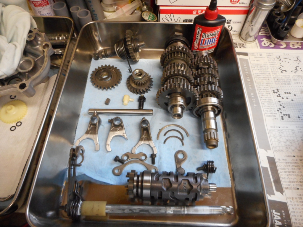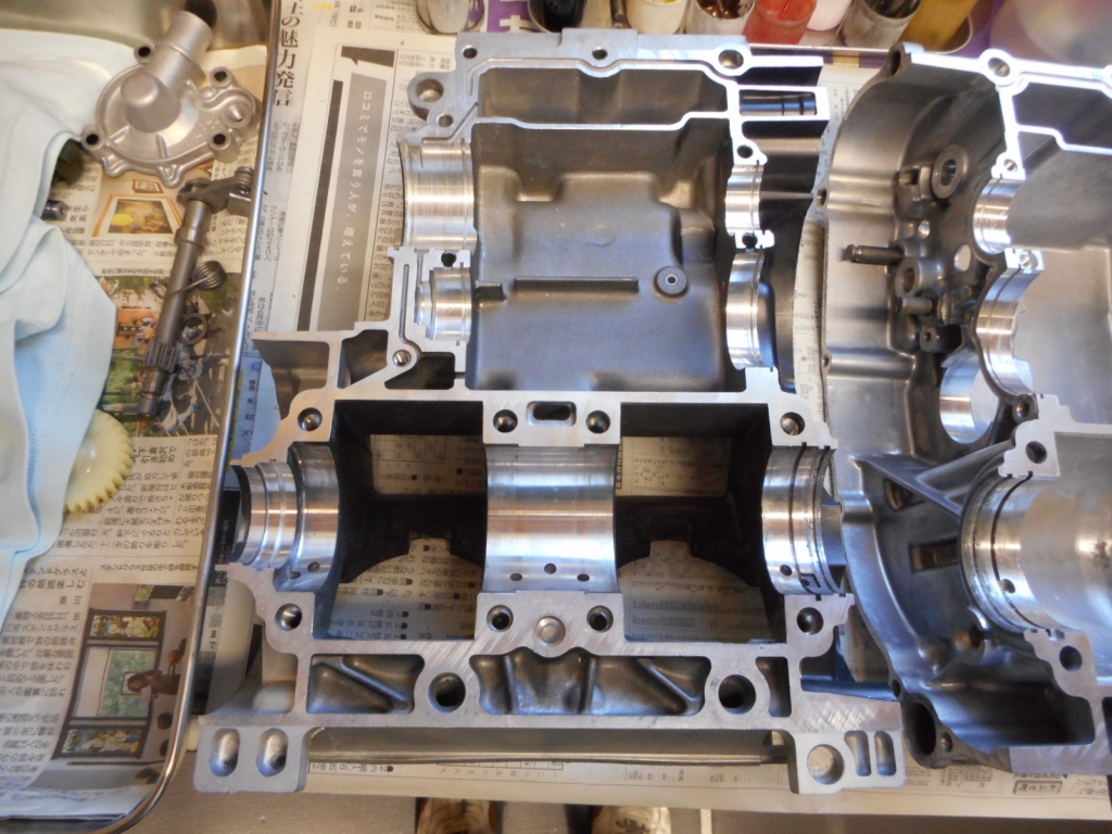 JUGEMテーマ:バイクメンテ クランクケースの組立 組付け部品につきましては事前に洗浄・測定・調整を行います。 トランスミッションドック・ギヤ歯・シフトフォーク溝点検良好。 シフトカム・フォーク・シャフト点検良好。 各ベアリング点検良好。 クランクシャフト振れ・サイドクリアランス・ベアリング点検良好。 ケース合面清掃・脱脂・液体ガスケット塗布 クランクケースボルト清掃・グリスアップ &nbs...