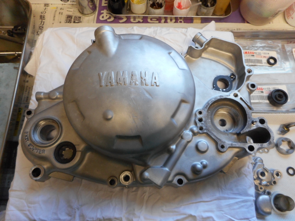 JUGEMテーマ:バイクメンテ 部品洗浄したケースを修正・点検します。 ケース合わせ面の面出し・バリ取り・ネジ山タップ修正など行います。 ケースマウントダンパーはまだ生きていましたので続投です。 このケースカバーは初期型のものでYAMAHAの文字が浮き出ています。 転倒による傷がありましたので少し修正しました。