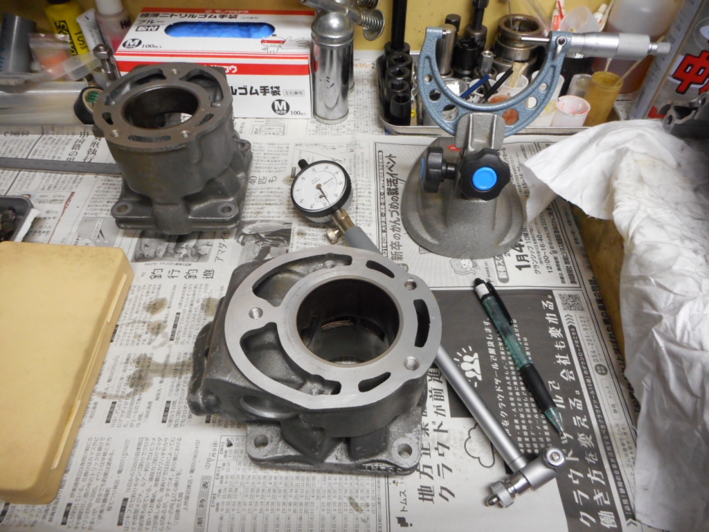 JUGEMテーマ:バイクメンテ 先日分解した部品の洗浄も終わり、各部品の点検を行います。 シリンダー内径をボアゲージで測定します。 今回のシリンダーはキズもなく良好でしたが排気ポート上部に サビによるピンホールが発生していましたがその他は問題ありません でしたのでホーニングのみで内燃機屋さんにお願いしました。