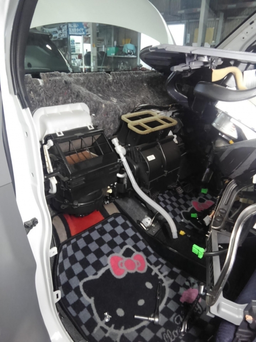 JUGEMテーマ:自動車整備 インパネアッセンを、外して エアコンユニットが見えました。 エンジンルームから、エアコンの配管と ヒーターのホースを外して、固定ナットを 外してあります。 ヒーターコア、ブロワモーター、エアミックスアクチュエーターも、一体で外します。 底のカバーを全部外して、 エバポレーターが、出てきました。 ガスが漏れてると、オイルも一緒に漏れてるので、ベタベタしています。 エバポをとると、こんなパネルや、サーミスタ、エキパン固定...