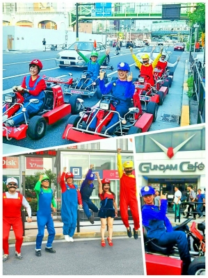 広島からいらしているお仲間を東京名物でおもてなししようと立てられたこの企画。 路上走行可能なナンバー付きカートを秋葉原でレンタル♪ 普通免許があれば運転出来ちゃいます。 駅前ロータリーで記念写真。 最後はみんなでマリオジャ〜ンプ… …結構マジにやってみました。 思ったより跳べてるでしょ?
