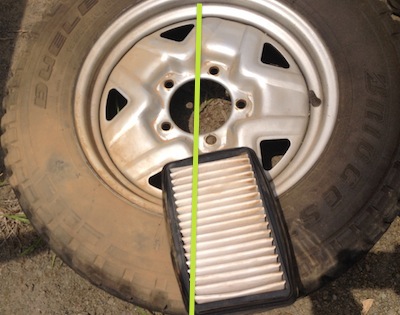 JUGEMテーマ:ジムニー オフロードを3時間走る耐久レースでは、埃を多く吸い純正のエアークリーナーでは役不足となります。 埃だらけの3時間耐久では役不足な純正エアークリーナー そこで、トヨタハイエースの3リットルディーゼルエンジン用を流用したところ、埃だらけの中でスロットル全開の3時間を余裕で耐えることができました。 3時間耐久レース後のエアークリーナー それからは、このエアクリーナーを使用しています。しかし、むき出しのため吸気音が大きく室内に響き...