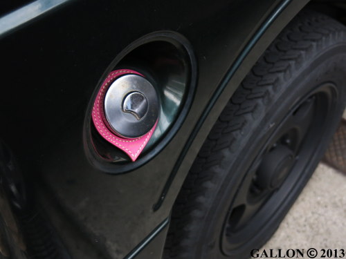 スズキ・ジムニーへの、ガスキャップリング装着例。ジムニー専用で作ったカスタムパーツかのように、かっこよく収まっていると思います。鮮やかショッキングピンクで、女子受け狙うそうです。実際のところ、こんな感じに給油口がボディに入り込んでいる車種の場合、ガスキャップリングがボディからはみ出しすぎているとダサすぎるし、逆に小さすぎてもバランスが悪すぎます。このちょこっと先端が飛び出るサイズ感が、絶妙なんだと思います。まあ絶妙と言っても、狙ったわけではないので、あまり自慢もできません。単なる偶然です。