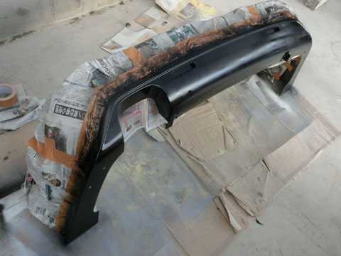 続き。 カナードをカットした時に出た端材を使って、こんなものを切り出してみました。 ほうっておくと片側が開いてきてしまうので、ボルト&ナットで固定しておきます。 バンパー側をガムテで養生し、その上からポリパテを塗ったこのパーツを押し当てます。 もうお判りだと思いますが、なんちゃってディフューザーです(笑)。 これでだいぶ、ディティールに凝ったデザインになりそうです。 パテが硬化したのを待ってから外し、整形していきます。 その間に、いよいよバンパー側を塗装していくことにします...