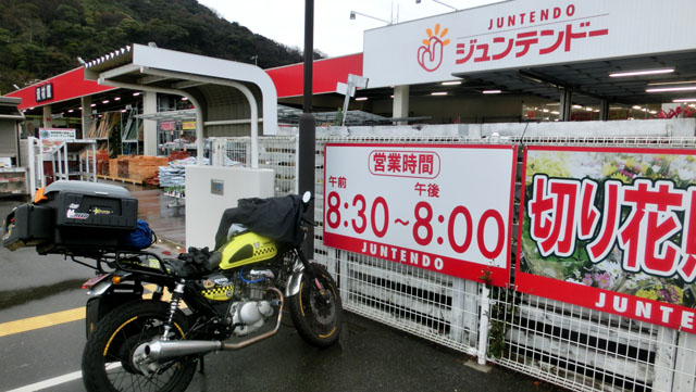 続き。 雨の中、九州に渡るため南下していくと、どかからかシャリシャリと異音が・・・。 真っ先に思い浮かんだのが、チェーンとセンタースタンドの干渉です。 確かに出発から1000kmを超えていますが、いくらなんでもセンタースタンドに干渉するほど伸びているとは考え難いです。 しかし実際、それらしい音がしているのですから、これはチェックしなければならないでしょう。 またしてもゆめタウン内、ジュンテンドー。 今回の旅ではお世話になりまくりです(笑)。 やはりチェーンがスタンドに干渉していました! ...