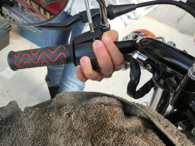 続き。 ポジション確認後、予定どおりコンドルハンドルを逆付け。 スイッチボックス類を元に戻していきます。 スロットル側。 やっぱりこちら側は難度高いです。 アクセルワイヤーが外れないよう、ブレーキマスターが傾かないよう、スイッチボックスを取り付けます。 最後にバーエンドを取り付けて各スイッチとワイヤー類の確認。 ブレーキホースがウインカーに干渉。 クラッチワイヤーも・・・。 自分の時はまったくこのようなことはなかったので、考えてみたところ、バックスペーサーを入れてな...