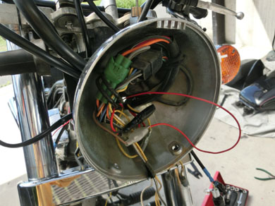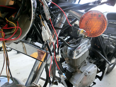 続き。 メインの電源を先日分岐させたばかりのポジション配線から取り出します。 これで全て繋がったことになります。 配線をまとめていきます。 また、首元を通る配線は特に注意です。 ステアリングを左右にこじって、ある程度余裕があるように(断線しないように)まとめていきます。 配線ついでにシガーソケット電源も取り付けました。 ここでメーターに電気が来ていることを確認。 シガーソケット電源も一緒にまとめていきます。 あとはタンク等外装を戻して完成! 大きなメーターがなく...
