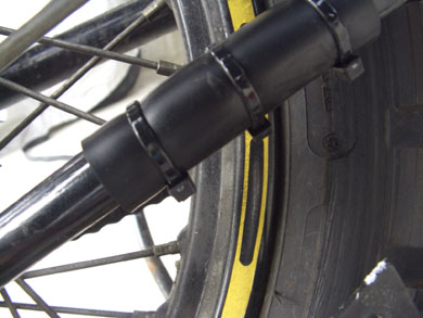 徳山ダムで見つかった不具合を修正します。 低速で走行中にリア周りから異音がしたので、すぐにそれと分かりました。 センタースタンドがタイヤに干渉していたのです。 ツーリング後半でトシさんが「後ろから見てるとスタンドが揺れている」とおっしゃっていたのは実はこれが原因です。 これまでは何ともなかったのですが、スプロケを変更したことでクリアランスが保てなくなっていたのでしょう。 出発前にはぎりぎり干渉していなかったはずですが、走行中にズレが生じたようです。 一旦ズレが発生すれば、瞬く間に状況は悪化...