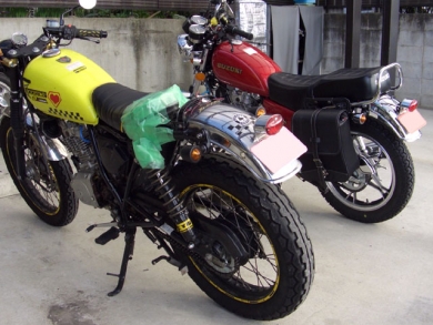 「師匠!ウインカー付けて下さい!」 →遅刻したし、デェト券1枚な。 「師匠!テールランプ自分で付けちゃいました!」 →そりゃ良かったね。 「師匠!テールランプは自分で付けたので次はフォークブーツ付けて下さい!」 →あのな・・・ 「師匠!テールランプ付けた時、失敗したみたいでナンバープレートのネジ落っことしちゃったので遅刻します!」 →デェト券2枚目な。 と言うわけで今日も愛弟子あっきーがやって来ました。 テール周りがおそろいになった2台。 フェンダーの位置全然違うけどね(笑)。...