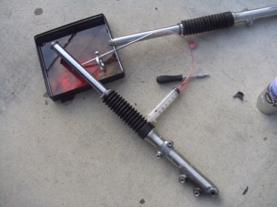 外したフロントフォークをバラし、オイル交換します。 こういったチャンスがないと、なかなか出来ないことなのでやっちゃいます。 予想通り、出てきたのはドブ水のようなオイル、しかも量が少ないような・・・? で、ヤマハ#15の硬めのフォークオイルを投入しました。 油面を合わせ、フォーク表面にはシリコングリスを塗って完了。 フォークを組む時には当然、ヘッドライトステーも組み込まなければなりませんので、こっちも並行作業。 ヘッドライトユニットをバラしてステーのみ取り出します。 ちなみに、GSのフォ...