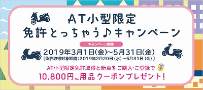 ?AT小型免許取っちゃうキャンペーン! 期間:〜5/31 https://www.yamaha-motor.co.jp/mc/campaign/125cc-license/ ?盗難保険プレゼント! 期間:〜6/28 https://www2.yamaha-motor.co.jp/SPT/Locator125cc2019/ ?ロードサービス1年間50kmプレゼント! 期間:〜12/31 通勤途中のパンクなど・・・無料で引き取りに!