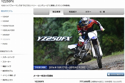 待望の一台やっと出ました!ありがとうヤマハさん! 価格 ¥777600(税込)登録は出来ません(^^) 発売予定 12月5日 受注期間 2015年2月28日まで 詳細↓ http://www.yamaha-motor.co.jp/mc/competition/yz250fx/ 今一番参加者が多いオフロードレース・・・JNCC。 そのレースに実際に参加しているヤマハ関係者によって開発された! モトクロス仕様のYZ250Fとの違いは・・・ 専用ECU・専用クラッチ・専用ミッション・ 専用セッティングされたフレーム・ ラジエターファン・MFバッテリ・ 専用前後サス・アルミ...