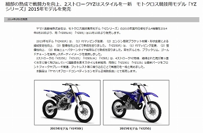 お待たせいたしました! YZシリーズ2015年モデル予約開始です。 10/31までの受注生産です。 http://global.yamaha-motor.com/jp/news/2014/0606/yz.html#__utma=168174206.1928916607.1393235936.1400910061.1402039055.13&__utmb=168174206.6.9.1402039089993&__utmc=168174206&__utmx=-&__utmz=168174206.1400807075.11.4.utmcsr=motorcycle-hc.com|utmccn=(referral)|utmcmd=referral|utmcct=/cgi-bin/motorcycle-hc/siteup.cgi&__utmv=-&__utmk=250711558 2ストYZが久々にマイナーチェンジ! エ...