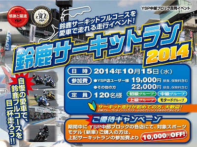 今年も開催します鈴鹿走行会! 国際サーキットをあなたも走ってみませんか? フルコースです! 当店購入車両での参加のお客様は19000円 他店購入者のお客様は22000円 下記モデル新車ご成約の方は10000円引き! 対象モデル 国内:VMAX.FJR1300.XJR1300.R1.FZシリーズ.MT-09.TMAX.WR/X 海外:R1.FZ8シリーズ.XJ6シリーズ.TMAX 定員に達し次第締め切りますので御了承ください。 当店購入車両の方はトラックにて輸送いたします(有料) 台数によって輸送費用が変わりますが例年1万円前後です。 県外の方は申込出来ません。 ...