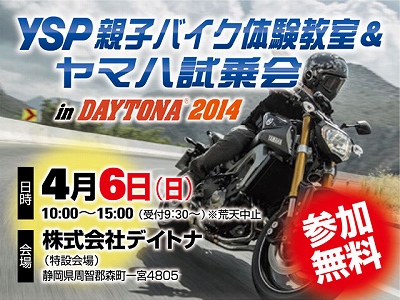 YSP静岡支部主催で開催決定! 日時:4月6日(日)10時〜15時 悪天中止 料金:無料(要予約車種アリ) 会場:デイトナ本社テストコース 森町 先着順にて試乗になるので、 ご希望の車種に乗れない場合がございます。 普通2輪免許で大型モデルも乗れる!・・・など、 その他下記参照ください。 ↑クリック拡大 (お願い) 毎年YSP各店の車両を持ち込み開催しております。 転倒時はお客様に修理代の請求をする事になりますし、 危険な走行をされたお客様には即時退去して頂くなど・・・ 安全運転でお願いして...
