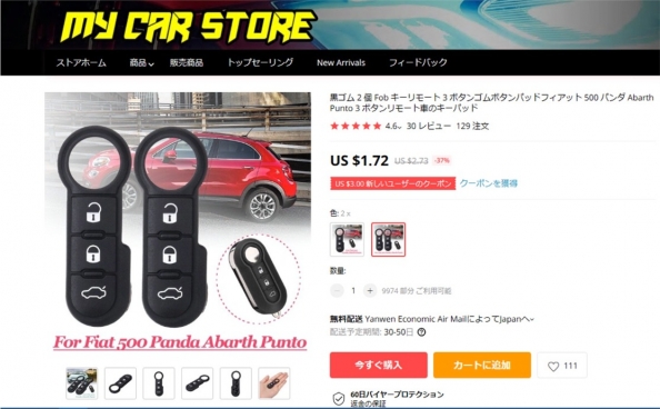 JUGEMテーマ:FIAT(フィアット) 先日キーパッドを交換したのですが、購入先はヤフオク、クーポン+ポイントがあったので実質0円でしたけど、実際は¥1,500です。 Facebookでもっと安価に購入できるサイトが紹介されていたので、こちらでも紹介します。 2個で$1.72 送料フリーです。1個でも買えます。 中国のAliExpressの中の店舗です。 Facebookの方は無事に商品が届いているようです、不安な方は私が購入してレポートしますので、それまでお待ち下さい。