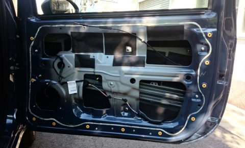 JUGEMテーマ:FIAT(フィアット) トリム、防水シートを外して、アウターパネルを中心に制振シート、オトナシートを貼ります。 スピーカーを外さないと防水シートが外せないので、リベットを取り除きスピーカーを取り外します。 今回は純正のスピーカーをそのまま使いますので、再取り付け用のSUSのM5かM6、長さ15mm程度のビス、ナットを用意しておきます。 ノイズ対策的には、この内部にニードルフェルトを詰め込むと良いのですが、窓ガラスが上下しますし、糸くずが排水孔を塞いで、水が溜まる可...