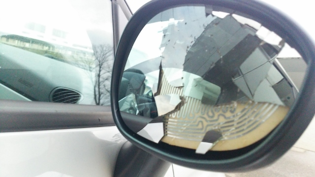 ドカッと雪が降った、この前の朝。 通勤途中に、こんなアクシデントに見舞われました。。。 ぐはっ。。。(´;ω;`)ウッ… 両側に雪の壁ができてる狭い道で 対向車のおばあちゃんに、ぶつけられてしまいました。。。 カバーもヒビ割れ。。。 ( ノД`)シクシク… 「あぁっ!! そんなんじゃぶつかるよーっ!! もっとそっち側に寄ってよーっ!!」 と思ったものの、こっち側も逃げ場がなく。。。 けっこうなスピードで、こんな狭い道を走ってくるおばあちゃんに なすすべもなく。。。 ア...