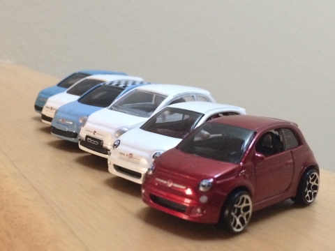 JUGEMテーマ:FIAT(フィアット) JUGEMテーマ:マニアックな物 自分の中での一応欲しかったフィアット500のミニカーが揃いました。ワインレッドもブリスターをひっぺがしました。 手前からホットホイール2台、マジョレット、奥の3台はトミカ。それぞれ良い出来です。 オマケの一台。 NEWRAY ちょっとスケールの大きいもの。でも確か800円位だったと思います。ライトも別パーツ。ドアも開閉可。ハッチバックは開きません。ホイールも忠実に再現されてますね。他の色も欲しいな・・・。