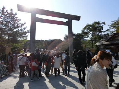 【伊勢参拝巡りの旅1】 伊勢神宮が式年遷宮を迎えたんで 参拝しに行って来たがや。 早朝7時前に名古屋を出て9時ぐらいに 到着したけど、既にこの混雑。 【神宮式年遷宮】 原則として20年ごとに、内宮(皇大神宮)・外宮(豊受大神宮)の二つの正宮の正殿、14の別宮の全ての社殿を造り替えて神座を遷す。このとき、宝殿外幣殿、鳥居、御垣、御饌殿など計65棟の殿舎のほか、装束・神宝、宇治橋]なども造り替えられる。 新しくなった正殿は綺麗じゃのぉ。 日本建築の素晴らしさが出とるね。 ( ̄▽ ̄)