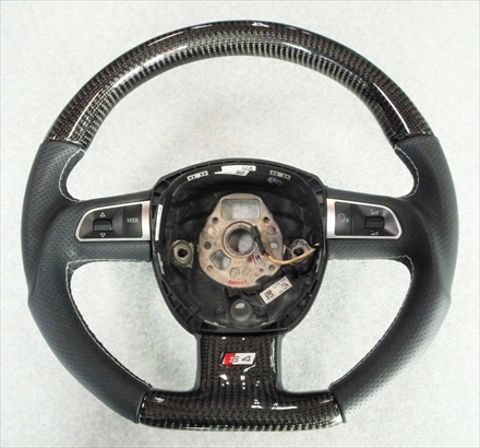 ★★Partsの御案内★★ リアルカーボン&パンチングレザー ステアリング for Audi S4(8K) 〜M/C S4(8K)に装着されている スポーツステアリングをベースに Dシェープに型状変更 レザー部には上質なパンチングカーフレザーに シルバー色ステッチが施され リアルカーボンとの絶妙なコンビネーションが スパルタンなコクピットを演出してくれます。 パドルシフト付タイプ 外径365m/m Dシェープデザイン パンチングカーフレザー&リアルカーボン ...