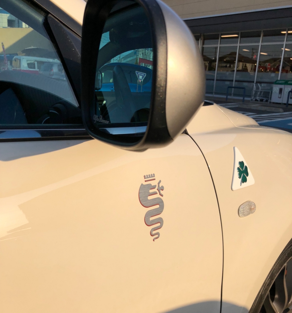 そして、もうひとつ新調。ビショーネシール。右向き。 ドアミラーの下に貼ったらいい感じだわ! 左向きはないので、運転席側だけだが、乗るときに毎回見れるのが嬉しい。 JUGEMテーマ:ALFA ROMEO
