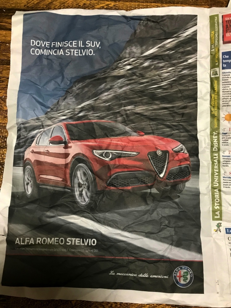 イタリアから注文していたパーツが届いた。その緩衝材に使われていた新聞になんとSTELVIO! 一面のでっかい広告。こういうの仕込んでくれるとは、ニクいねぇ。 DOVE FINISCE IL SUV, COMINCIA STELVIO. 英語にすると、Where the SUV Ends, Starts STELVIO.って感じだから、つまり SUV終わるところにSTELVIOあり。 うおー、攻めてるねぇ。 他にもないかな、といそいそと広げてみると。 お、いたいた!STELVIOとGIULIAが並んでるじゃない!こっちは解読する気、全くな...