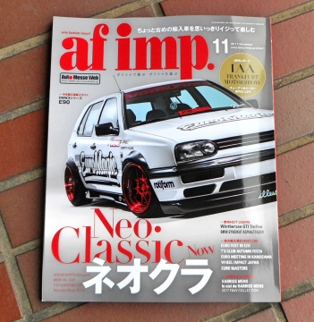 af imp.11月号 輸入車スタイルアップの魅力を 広く知らしめた Neo Classicな名車 GOLF3が表紙を飾る11月号 FRANKFURT MOTOR SHOW 2017年の特集が掲載されております♫ チューナーブランドの自信作が 展示されていますね♫ ネオクラ。。 ネオクラッシックの事で ちょい古めの輸入車を おもいっきいイジって楽しむってこと♫ ちょいフル世代をベースカーに イマドキ感しっかりとプラスアルファする。 ネオクラなカーライフ ...