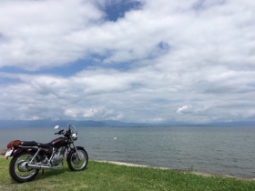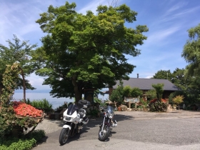 今日の午前中、夫は自転車に乗りに行ったし、 子どもたちは昼まで部活。 家のことを一通りし終わって、 朝の真っ青な空から比べると雲が増えたけど 少し涼しいし、これは行っちゃう?ってなことでお散歩してきました♪ いつもの琵琶湖は先客がいたので いつものとこよりちょっと北上。 写真を撮ってると、 作業してはった近所のおじさまが「何cc?」 どこから来たのかとちょこっとおしゃべり。 「また来てなー」と見送られて出発。 バイクの向こうにあるの、何かわかるかな? テレビで見たことない? ほら、あれ...