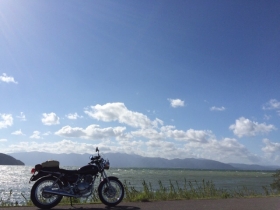 子どもたちの夏休みが終わってからというもの ずーっと天気が悪くて バイクのおあずけ状態が続いてたけど 昨日、ようやく乗れました〜♪ シートバッグっぽく装着したリュックのお試しも兼ねてお散歩へ。 いつもの琵琶湖。 青空の下、バイクで走るんは気持ちいい〜♪ ちょっと…いや、かなり風が強くて バイクには向かない感じやけども。 いい天気に、 雨の心配がいらない空に我慢できなくて 乗っちゃいました。 シートバッグっぽいのもきっちり付いてて 特に問題ないですな。 いいんでない? 風が...