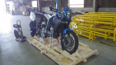 JUGEMテーマ:海外ツーリング どもです、名古屋にあるゲストハウス音速別荘に沈没してます。 今日は、バイクをクレートに梱包するということで、協和梱包さんへ持って行きました。 クレートに囲われる前のテネレさん。 カウルとミラーを外して、恥ずかしい姿になってますね…w つか、画を見てもらうと分かる通り、タイヤも外さず左右のパニアもつけてます。 当初は、フロントホイールもパニアもハンドルバーも外して、輸送費を安くしようと思ってたんですけど、 組み立てにもたついている間に絡まれて窃盗にあった...