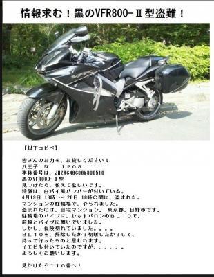 JUGEMテーマ:ガレージ・カーポート 盗難情報 VFR800ー?型 【以下コピペ】 皆さんのお力を、お貸しください! 八王子 な 1208 車体番号は、JH2RC46C06M800510 黒のVFR800ー?型 見つけたら、教えて欲しいです。 特徴は、白バイ風バンパーが付いている。 4月19日 18時 〜 20日 18時の間に、盗まれた。 マンションの駐輪場で、やられました。 盗まれたのは、自宅マンション。 東京都、日野市です。 駐輪場のパイプに、レットバロンのBL10で、 前輪とパイプに繋いでいました。 しかし、保険切れていま...