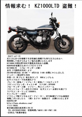 JUGEMテーマ:ガレージ・カーポート 盗難情報 KZ1000LTD 【以下コピペ】 友人さんからの情報ですが些細な情報でも持ち主さんの元へ 無事帰してあげられようご協力お願いいたします KZ1000LTD習志野7835千葉県市川市から盗難、 KADOYAの後藤さんのバイクだそうです KZ1000LTD (ブルーサンダース製) 自宅(千葉県市川市)より 2014年4月20日 22:00 〜 4月21日 7:00 の間にヤラレました ... ナンバー:習志野ち7835 外装:Z1 外プレス 青玉虫タンク 900エンブレム 左サイドカバー下の爪割れアリ ブレーキ...