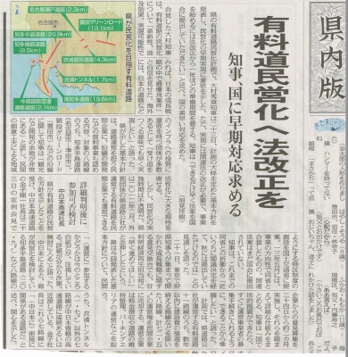 JUGEMテーマ:ガレージ・カーポート 4月24日の中日新聞の県内版の記事でございますが、有料道路民営化へ法改正をとございます。 民営化される事により競争原理が働き、より走り易く安全な道路になればと思います。
