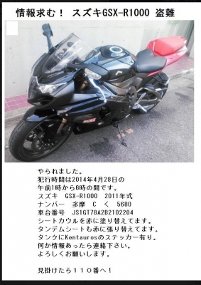 JUGEMテーマ:ガレージ・カーポート 盗難情報 GSX−R1000 以下コピペ 情報求む! スズキGSX-R1000 盗難 やられました。 犯行時間は2014年4月28日の 午前1時から6時の間です。 スズキ GSX-R1000 2011年式 ナンバー 多摩 C く 5680 車台番号 JS1GT78A2B2102204 シートカウルを赤に塗り替えてます。 タンデムシートも赤に張り替えてます。 タンクにKentaurosのステッカー有り。 何か情報あったら連絡下さい。 よろしくお願いします。 見掛けたら110番へ!