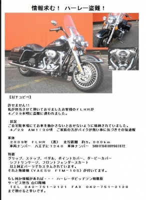 JUGEMテーマ:ガレージ・カーポート 盗難情報 ハーレー 【以下コピペ】 許せません!! 私が担当させて頂いておりましたお客様のFLHRが 4/29未明に盗難に遭われました。 状況 ご自宅駐車場にてお車を動かさないと 出せないように格納されていました。 4/29 AM1:30頃 ご家族の方がバイクが無い事に気づきその後通報 車体 2009年 FLHR (黒) 走行距離 約5,000km 車両ナンバー 八王子に1240 車体ナンバー 5HD1FB4109Y661972 特徴 グリップ、ステップ、ペダル...