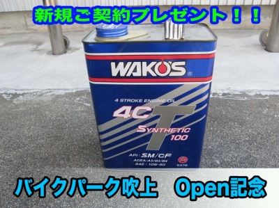 JUGEMテーマ:ガレージ・カーポート バイクパーク吹上 オープンを記念致しまして、 新規契約者様に、ワコーズ オイル 4CT-Sを、4リットルをプレゼントさせていただきます!! 『定価10,368円(税込) 10W−50』 ポルシェにも純正採用されている高性能オイルでございます。 ターボ車にも使用できます。もちろん4サイクルENGのオートバイにも、 何の問題無くご使用して頂けます。 数に限りがございますので、先着順となります。 無くなり次第終了となります事を、ご了承ください。 必ずブログを、見たとご申告願...