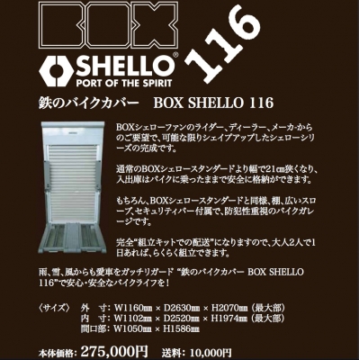 JUGEMテーマ:ガレージ・カーポート 遂に、シェローのホームページ(www.shello.co.jp)から、正式に BOX SHELLO 116 の販売アナウンスがなされました。 実際に使用し、細かい改良を、何度か施され、遂に完成となりました。 絶賛販売中でございます!! 幅が116センチに狭められましたが、殆どの大型バイクを収納可能でございます。 バイクパークナゴヤでも、近日中に導入を予定しております。