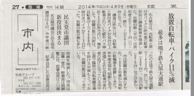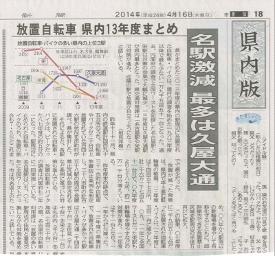 JUGEMテーマ:ガレージ・カーポート 4月16日の中日新聞、県内版の記事でございますが、 先日読売新聞でも取り上げられた、放置自転車•原付バイク減少の記事でございます。 より詳細な記事が書かれておられますので、一見の価値がございます。 駐輪場が整備されたのが、減少の原因なのは明らかな事だと思います。 ルールを守ってより住み良い街になる為には、皆さん一人一人の協力が必要だと思います。