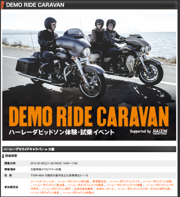 JUGEMテーマ:ガレージ・カーポート 今週末の8日9日と、大阪南港ATCピロティ広場にて、ハーレーデモライドキャラバン 2014 が行われます。 今年最初のデモライドキャラバンでございます!!ハーレーの最新モデルを、一気に試乗出来る、貴重なイベント!! 購入を検討なされておられる方は、来月の名古屋まで待たれるか、とりあえず、今週末大阪に試乗しに行かれて、再度名古屋で試乗し、お気持ちを確認なされてから、購入なされるのが、一番間違いないと思われます。 4月からの増税を控え、購入するなら今しかないタイミン...